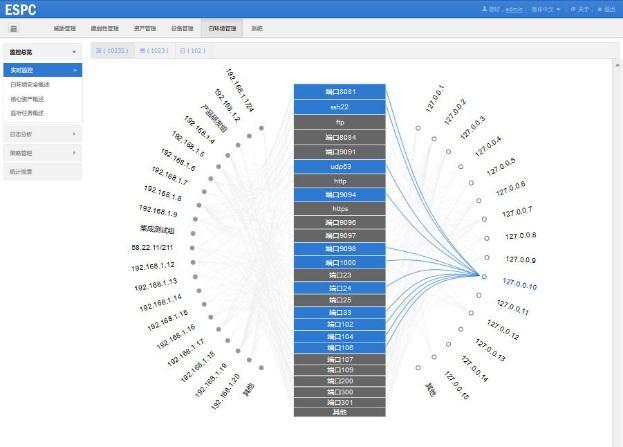 優(yōu)化圖形時(shí),我們對(duì)很多細(xì)節(jié)進(jìn)行了調(diào)整: – 考慮太密或太疏時(shí)用戶的感受,只展示了TOP N。 – 弧度、配色的優(yōu)化,與我們UI界面風(fēng)格相一致。 – IP名稱超長(zhǎng)時(shí)省略處理。 – 微觀視角中,源和目的分別以藍(lán)色和紫色區(qū)分,同時(shí)在線上增加箭頭,箭頭向內(nèi)為源,向外是目的,方便用戶理解。 – 交互上,通過(guò)單擊鉆取到單個(gè)端口和IP的信息;鼠標(biāo)滑過(guò)時(shí)相關(guān)信息高亮展示,這樣既能讓畫面更加炫酷,又能讓人方便地識(shí)別。