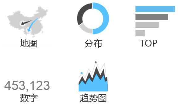 分析清楚數(shù)據(jù)后,就要找個(gè)合適的箱子把這些“蘋果”裝進(jìn)去。上一步,或許還可以靠自身的邏輯能力,采集到的現(xiàn)成數(shù)據(jù)分析得到,而這一步更多地需要經(jīng)驗(yàn)和閱歷。幸運(yùn)的是,現(xiàn)在已經(jīng)有很多成熟的圖形可以借鑒了。從和業(yè)務(wù)的溝通了解到,需要匹配的圖形有中國(guó)地圖、餅圖、top圖、數(shù)字、趨勢(shì)等。