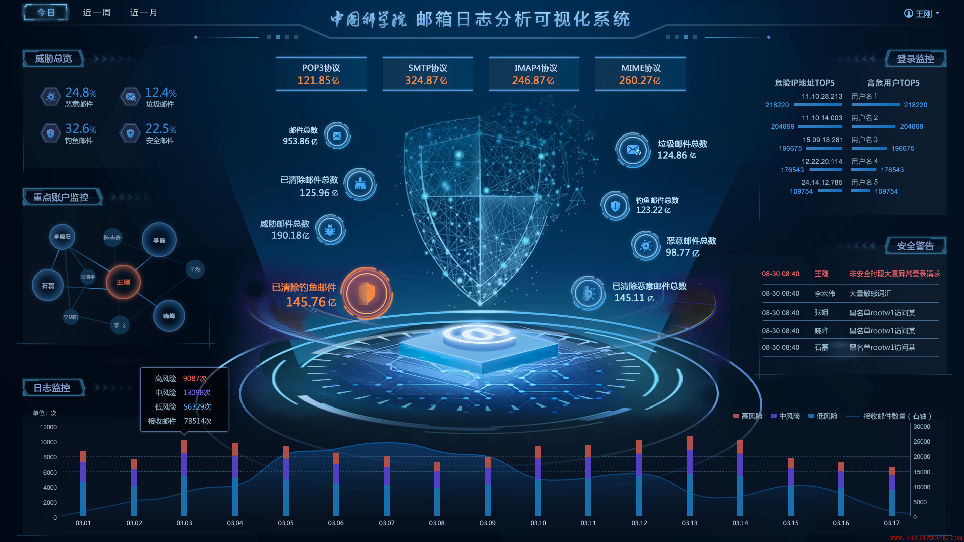 藍(lán)藍(lán)設(shè)計(jì)也在給中科院各個(gè)院所設(shè)計(jì)界面,上圖是給郵箱日志分析可視化系統(tǒng)設(shè)計(jì)的界面概念稿。為了設(shè)計(jì)好,我們搜集了各種資料文章和行業(yè)界面參考,了解郵件系統(tǒng)的行業(yè)術(shù)語(yǔ),畫出交互原型、視覺設(shè)計(jì)稿。