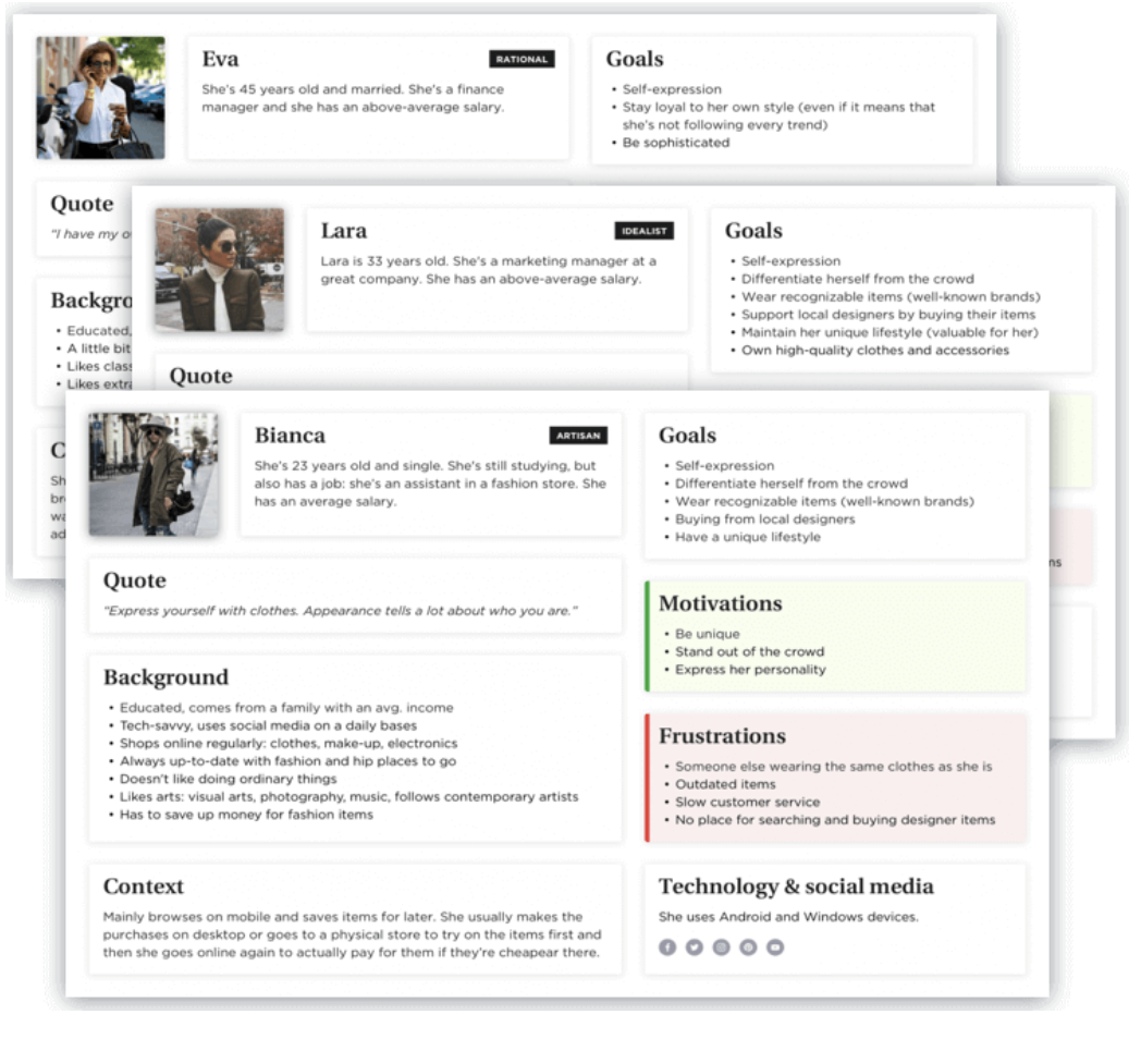 按照我們的邏輯順序,首先是創(chuàng)建角色。我們幾乎在所有項目中都會使用。基于我們的產(chǎn)品或服務(wù)的目標(biāo)群體,即不同的潛在客戶,構(gòu)建虛構(gòu)人物個性。這個工具可以讓我們更多地了解客戶的需求、問題、動機(jī)和行為。我們通過研討會、頭腦風(fēng)暴或通過定性和定量研究“簡單地”收集盡可能多的數(shù)據(jù)來實現(xiàn)這一目標(biāo)。