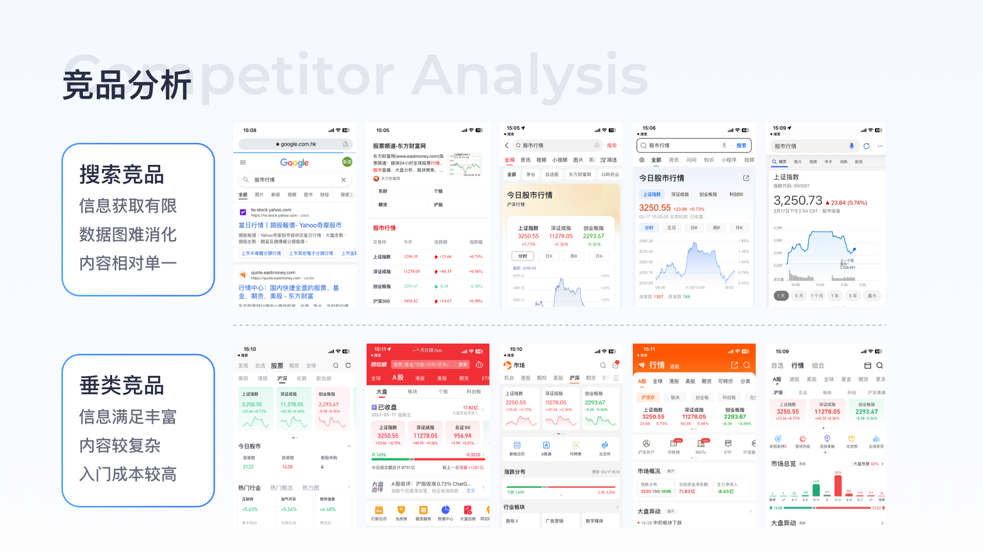 3)內容布局及樣式上相對單一:由于滿足卡片使用了通用的股票行情設計模板、且需求滿足有缺失,導致了內容及布局上相對單一,與競品相比在內容豐富度及視覺樣式上差距較大。