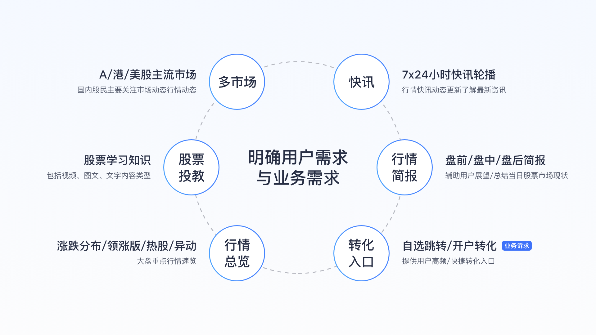 用戶需求:結合用戶高頻使用功能分析發現小白用戶、一般散戶、專業用戶均對行情功能有高頻率的使用需求,具體需求包括了解多市場、關鍵指數行情、了解最新快訊、重要行情動態、盤前/盤中/盤后簡報,再結合小白用戶占比高且對百科內容有需求的現狀,知識科普信息也是相關待滿足需求。