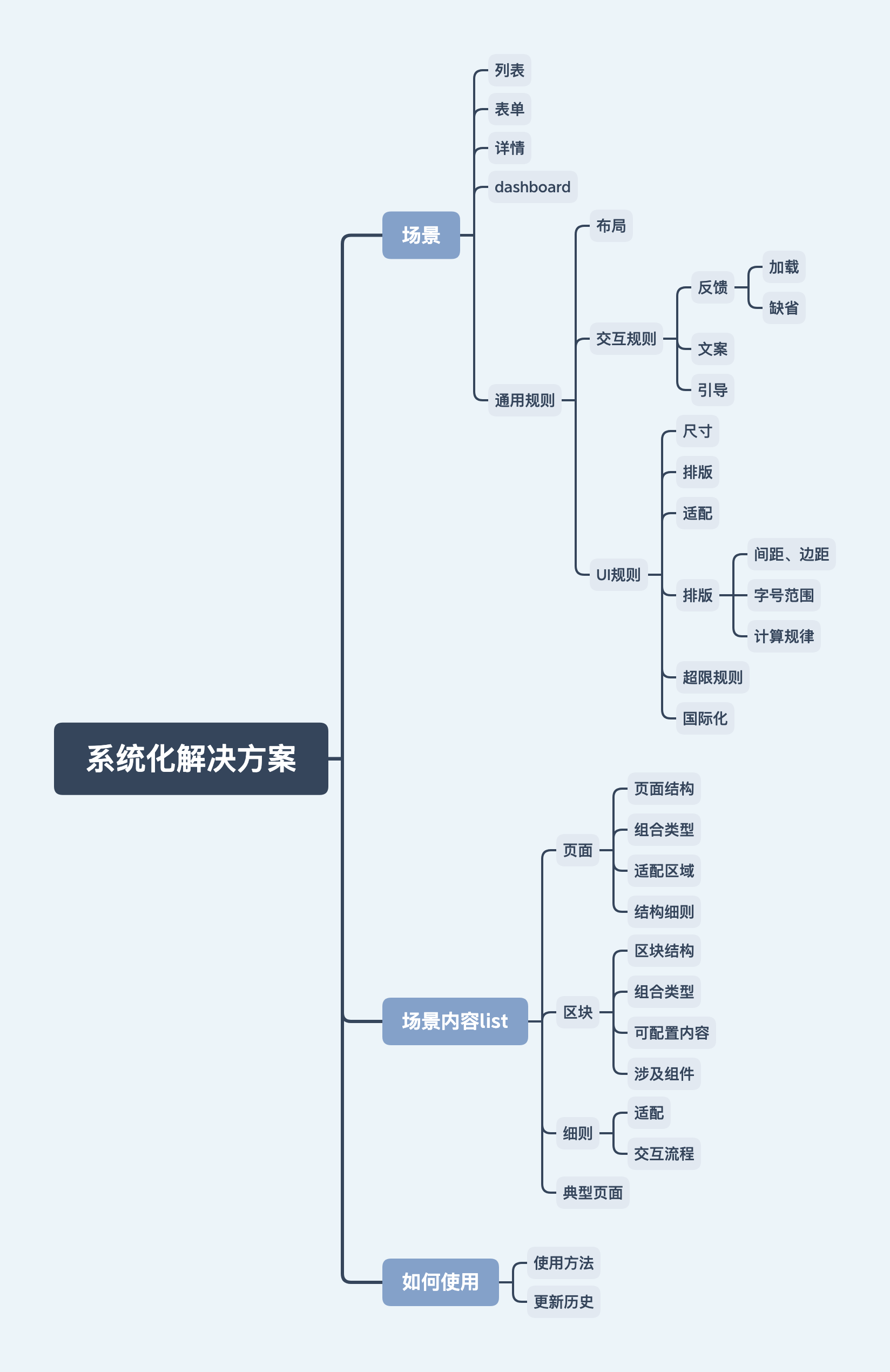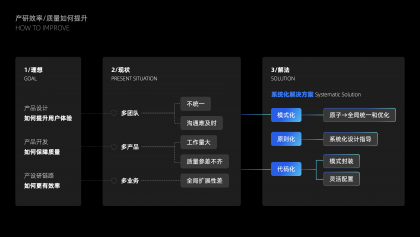 從第一步全盤的信息拆解和歸納, 已經發(fā)現問題, 這一階段主要2點:第一是如何通過設計規(guī)則來避免同樣的問題產生,第二是如何通過簡單的規(guī)則重組減少多人合作記憶復雜度。思路類似于設計一個界面,首先得有一個布局劃分,不同的區(qū)塊要放哪些內容,再到區(qū)塊里的細節(jié)內容規(guī)則,從而抽象出由布局到區(qū)塊的設計規(guī)則和可復用的組件。