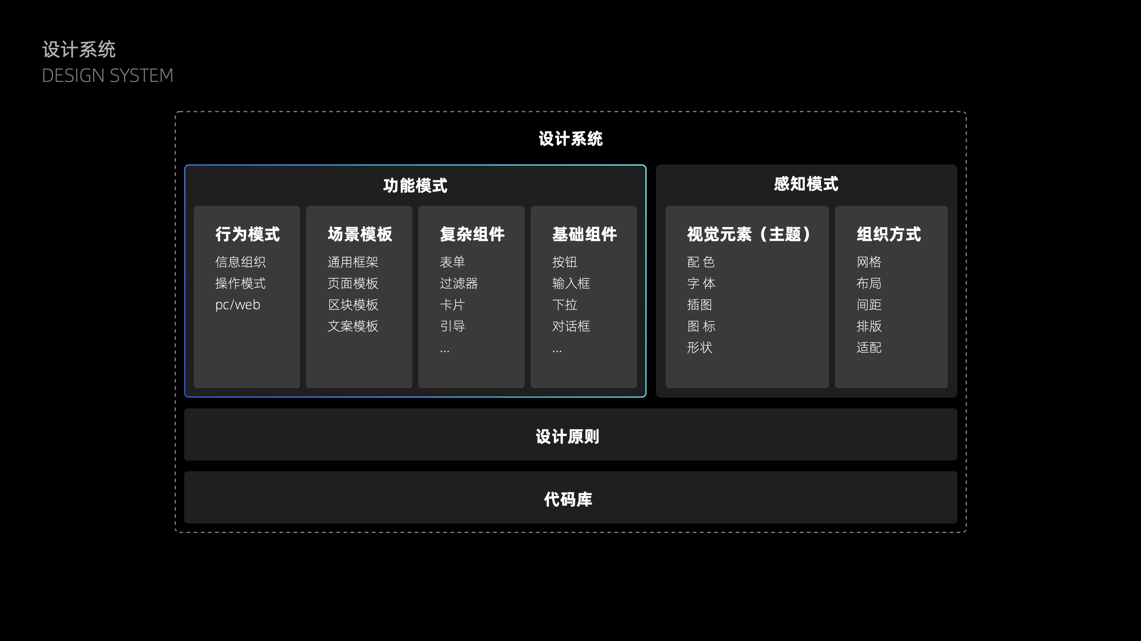 大多數日常需求大多是從單點出發(fā),當點變多變復雜了,就容易出現上述說到的現狀問題。所以解決方案需要基于業(yè)務全盤進行設計抽象:從元素——組件——區(qū)塊——頁面——功能流程沉淀設計規(guī)則并代碼化,來靈活提供拼裝N個不同頁面的機制,幫助團隊更系統(tǒng)化的進行產品設計。從組成內容不難看出,解決方案是需要建立在基礎組件基礎上,與基礎組件、復雜組件、行為模式共同組成設計系統(tǒng)的【功能模式】部分。