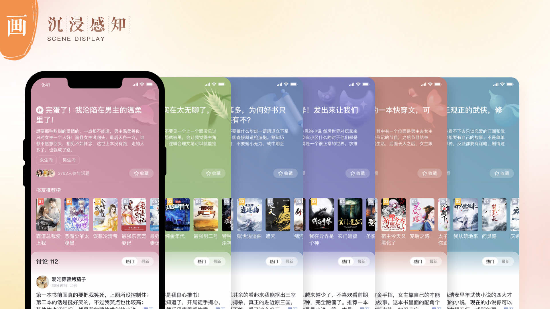人文感設(shè)計語言融合了簡約、舒適、自在的設(shè)計體驗,讓人能夠輕松沉浸其中,并感受到獨特的國風韻味和情感內(nèi)涵。小說設(shè)計團隊從“色、字、構(gòu)、畫”四個維度進行拆解。