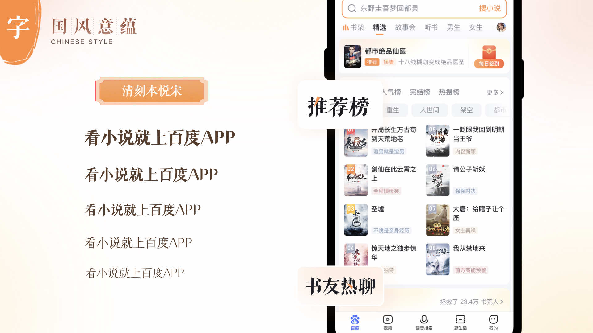 基于國風意韻感,設(shè)計團隊在文字的使用上,也選擇了一套襯線體字體,該字體字形瘦長,柔美清透且識別度高。在界面中,主要在標題區(qū)應(yīng)用這套字體,將其中的一筆進行跳色點綴,不僅讓用戶閱讀舒適,而且提升百度小說的品牌識別度。