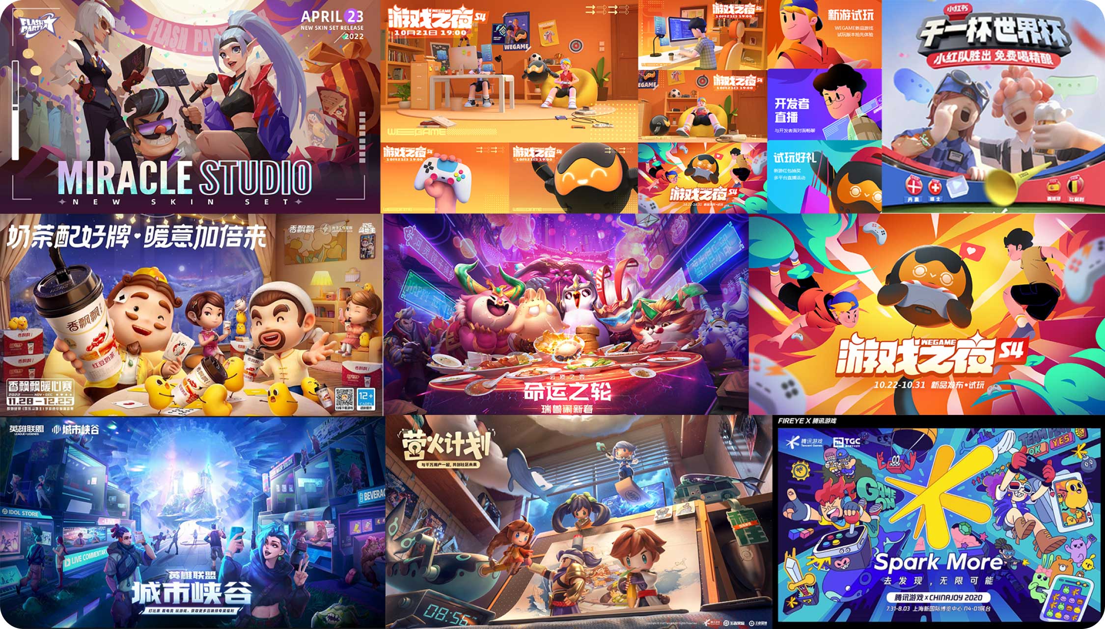 大概描繪了幾個伙伴在組隊玩游戲,因為獲得了勝利相互擊掌(give me 5)的輕松愉快的畫面。周圍有一些和游戲相關的元素,IP形象也在畫面中心露出,強調與品牌之間的關系。
