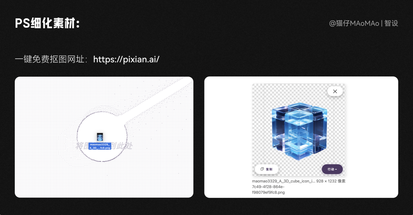3D主視覺的部分,我們需要先進行摳圖,如果不想使用 PS 手動摳圖,這里推薦我常用的一鍵免費摳圖網站:https://pixian.ai/ ,處理簡單的圖片,直接把圖片扔進去就好了,簡單好用~