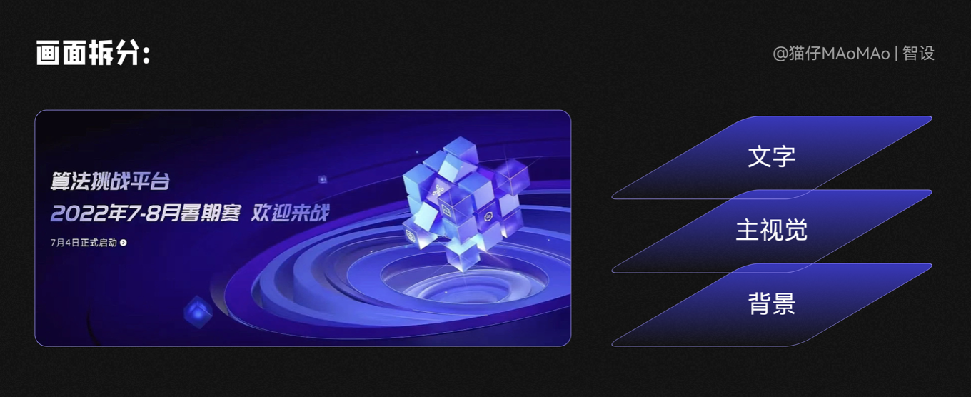 確定參考方向后,腦袋里面大致有了畫面思路,主視覺在畫面右方,螺旋狀背景突出主視覺,文字排版在左邊,整體色調為藍色+青色光感。這里我們對所選參考圖進行拆分: