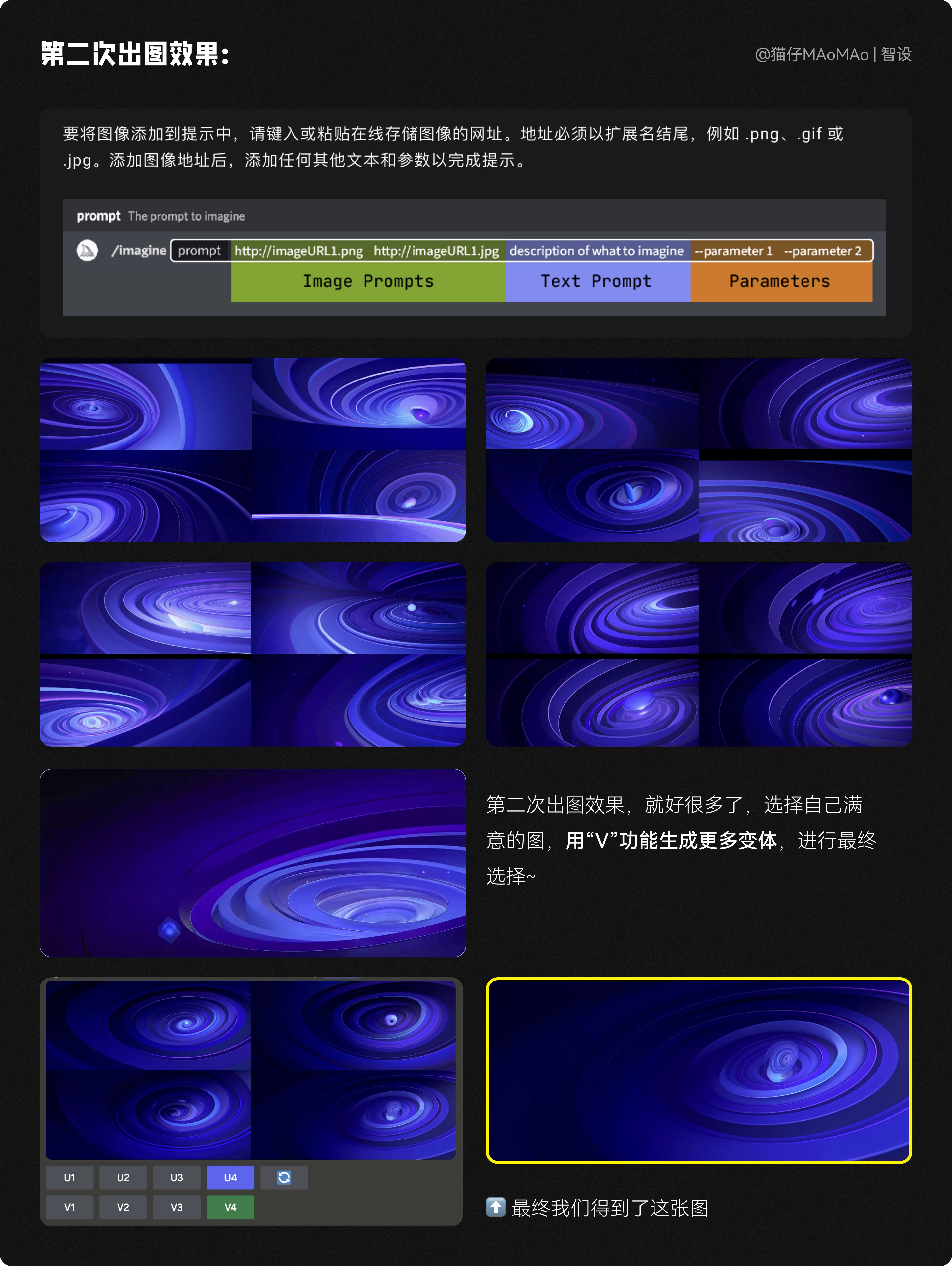使用 --iw 后綴參數時,需要“墊圖”,就是把參考圖的鏈接加到關鍵詞中,接下來我們看看關鍵詞不變的情況下,只加墊圖和后綴參數,能不能達到我們想要的效果。
