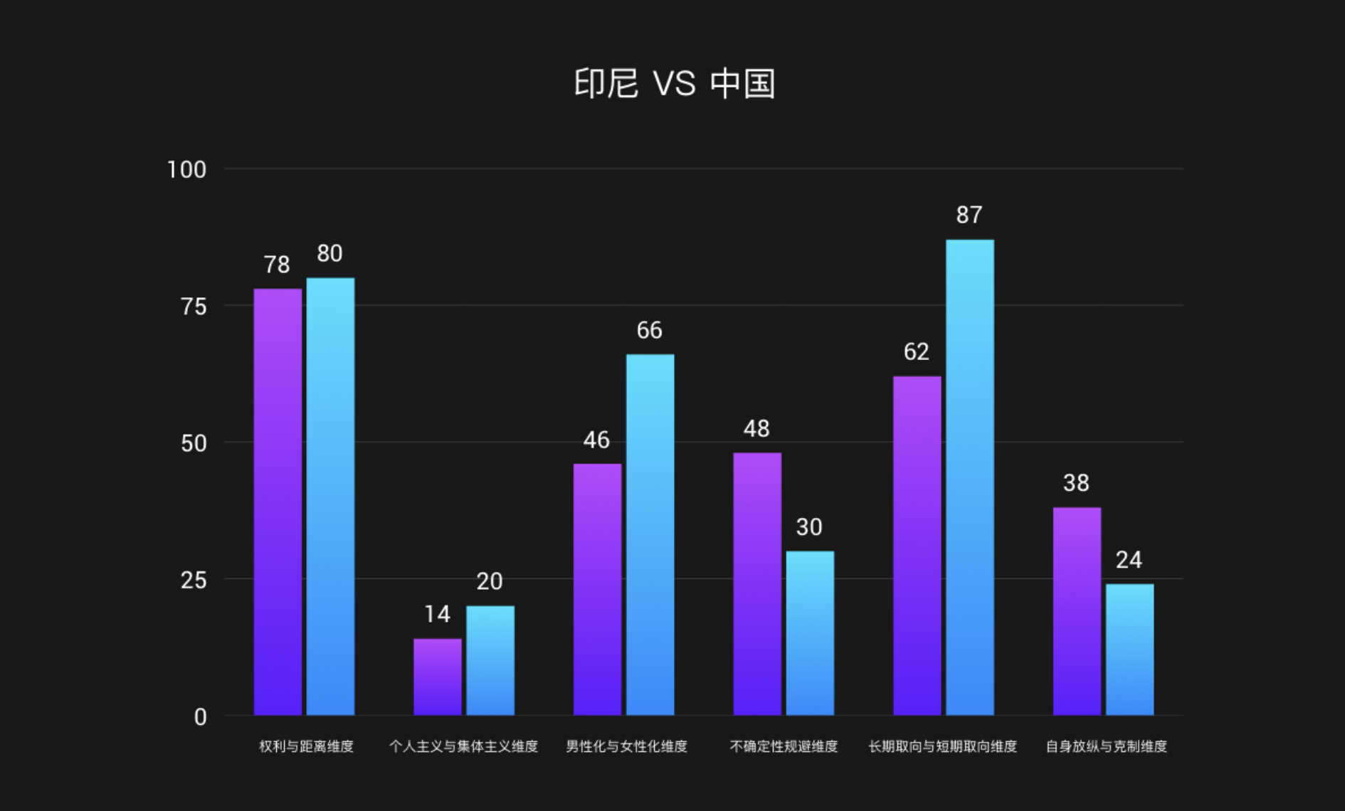 首先建立文化場景,如上圖所示,主體國家是印尼,對比國家是中國。對印尼和中國的群體進行文化維度分析。