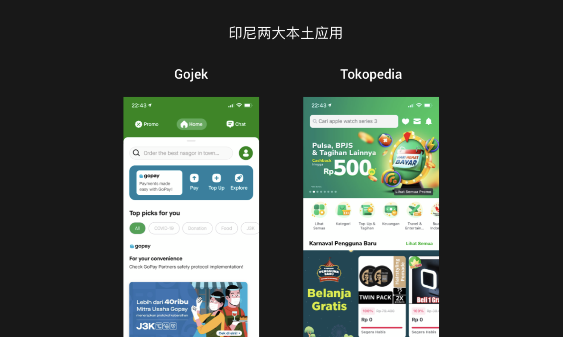 由于是穆斯林國家,綠色深受當地人喜愛。在伊斯蘭教中,綠色象征著生命與自然。除了綠色,白色和藍色也是當地人民所喜愛的顏色。在選擇自己產品的主色調時,不妨參考這幾種顏色。下圖是印尼的兩大本土應用,Gojek 是當地的一個超級 APP,提供出行、物流、食品、購物、支付等一站式服務,可以理解為是滴滴、美團、餓了么、支付寶、順豐等這些公司產品服務的集合,Tokopedia 是當地的電商平臺。兩家都選擇了綠色為主色調,這是因為創(chuàng)始人有虔誠的信仰,在伊斯蘭教中,綠色通常被認為是伊斯蘭教的象征。