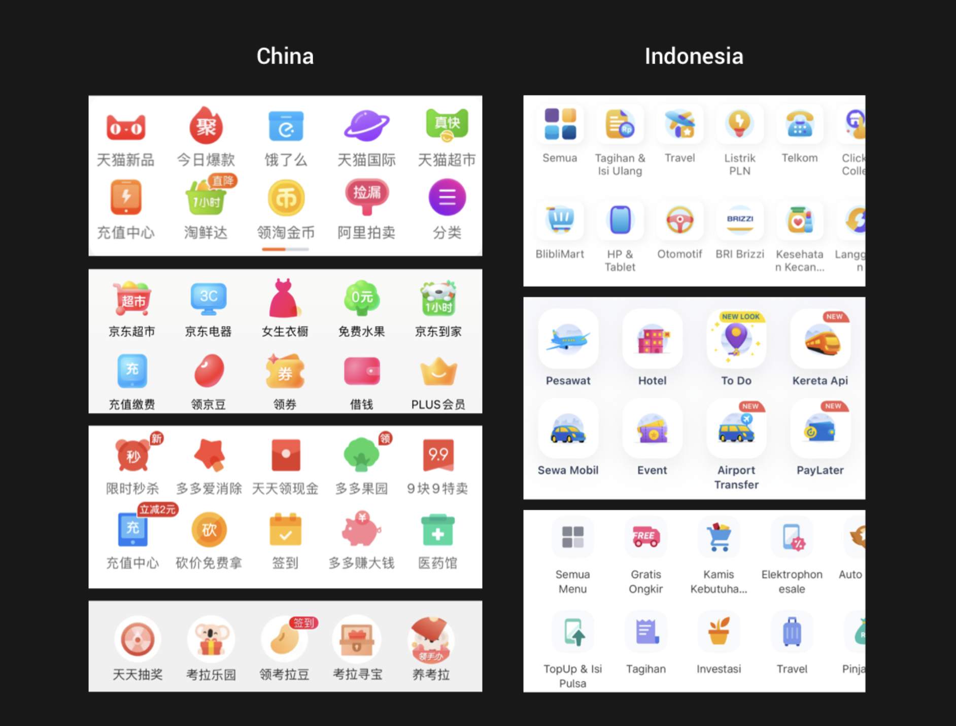 與中國主流的幾家電商平臺相比,印尼的金剛區(qū)圖標在細節(jié)和色彩的處理上更加豐富。如下圖所示,中國的圖標色彩比例大部分是:90%的主色+10%輔色;而印尼的圖標色彩比例是:70%的主色+30%的輔色。