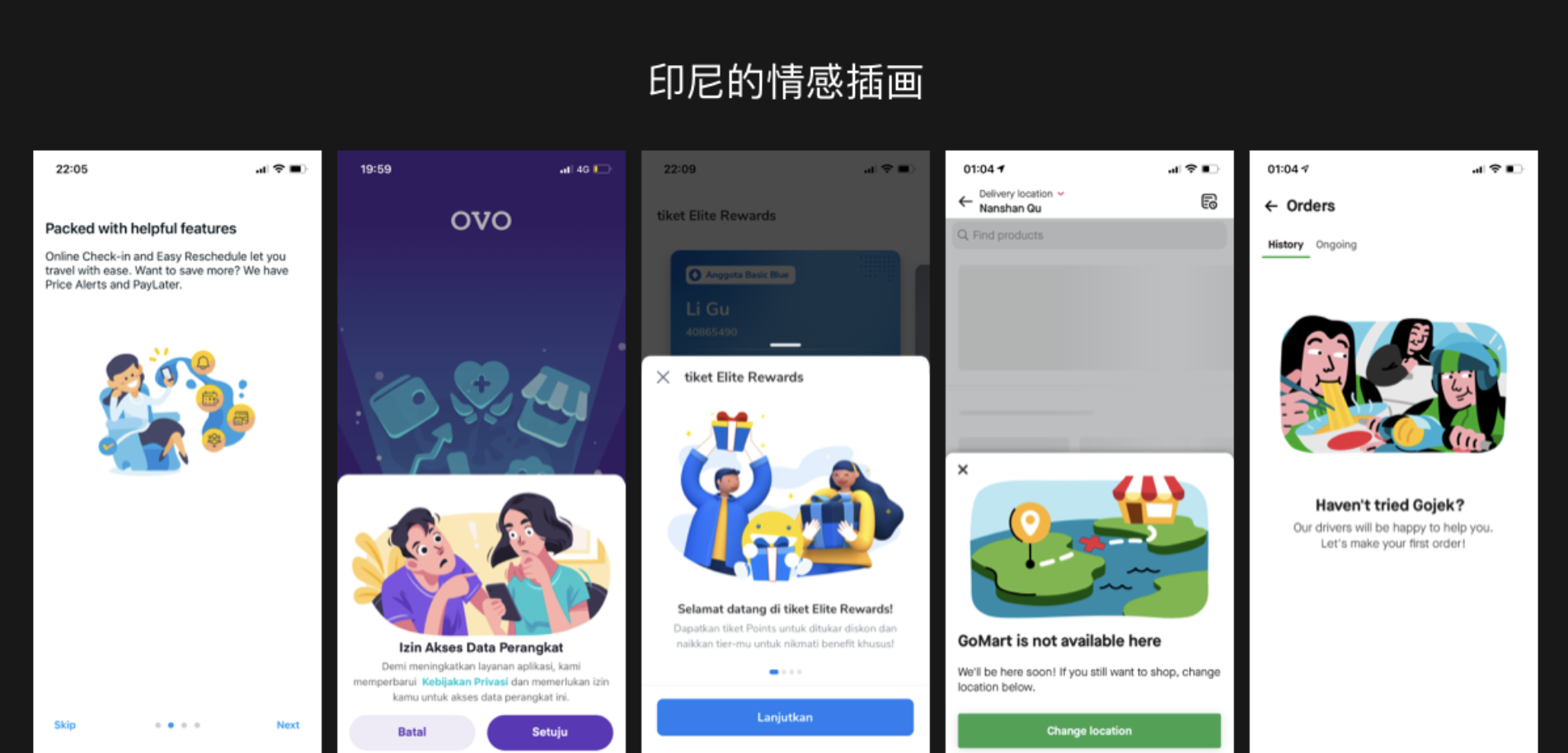 截了幾大主流 APP 的部分插畫場景,都是采用的扁平或 3D 風格。在 hofstede 的文化維度研究中,印尼是集體主義國家,集體主義國家在創(chuàng)作上喜歡用生活常見的生活符號來傳遞深層的含義。比如下圖中的引導和缺省頁場景,引導的同時也運用了生動有趣的生活上的情感插畫來緩解和安撫用戶的體驗情緒。在設計表現上,插畫的色彩鮮明,高飽合的色彩喚醒度較高,容易把用戶的注意力轉移到畫面上來,且插畫都是圍繞一個故事性的場景來開展,具有很強的觀賞性,從而打造了良好的用戶體驗流程。