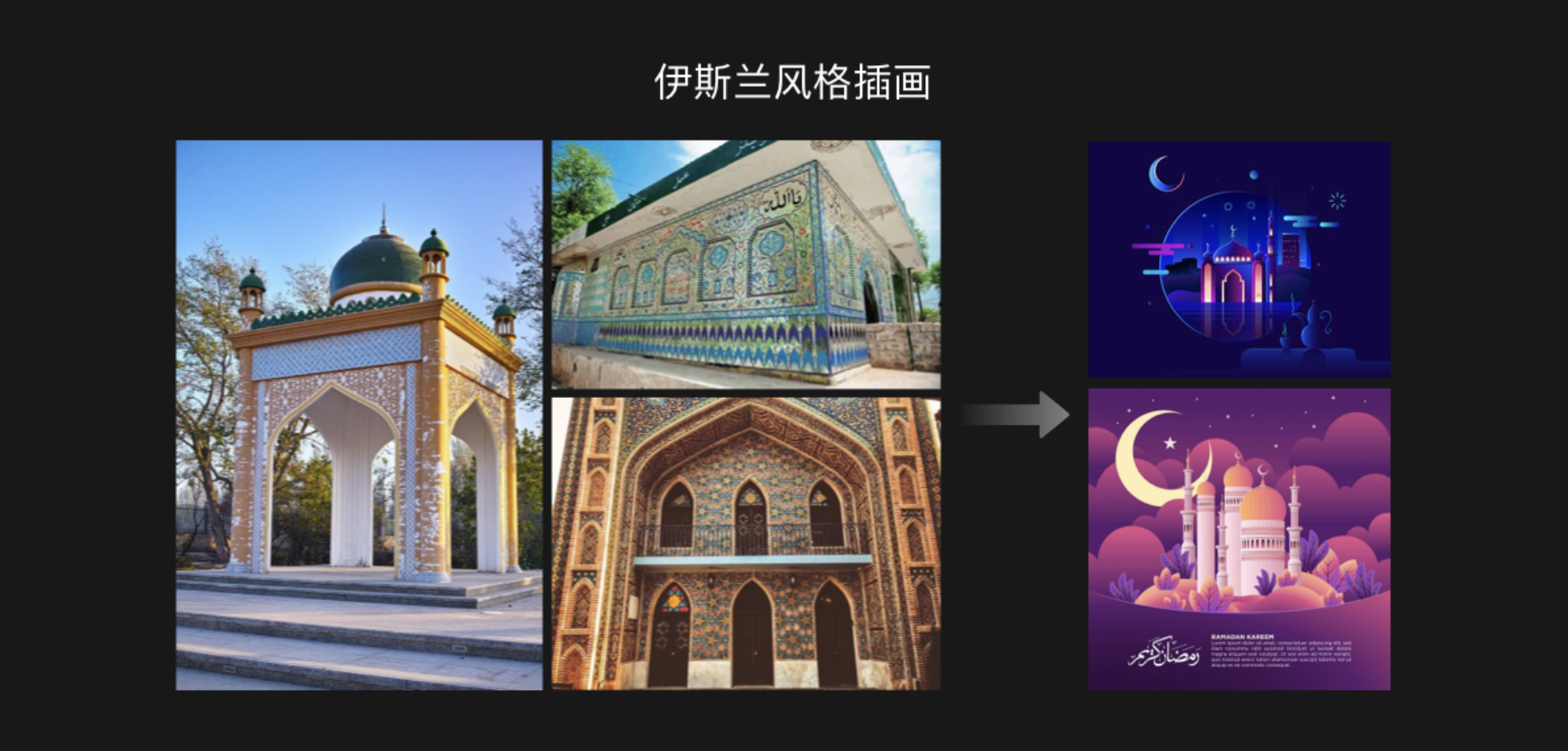 如果是想要創(chuàng)作較強的宗教色彩的風格插畫,可以嘗試融入伊斯蘭文化的藝術。如下圖中插畫中,在造型上就提煉了穹頂、拱門、尖塔的形狀。伊斯蘭藝術中主要的裝飾物是幾何紋理、植物紋理和文字紋理,紋理之間均衡、對稱、有節(jié)奏感。在色彩上也可以使用藍綠色,藍綠色在伊斯蘭藝術中占有重要地位。裝飾紋理再加上藍綠色,形成了獨特的伊斯蘭教風格藝術。