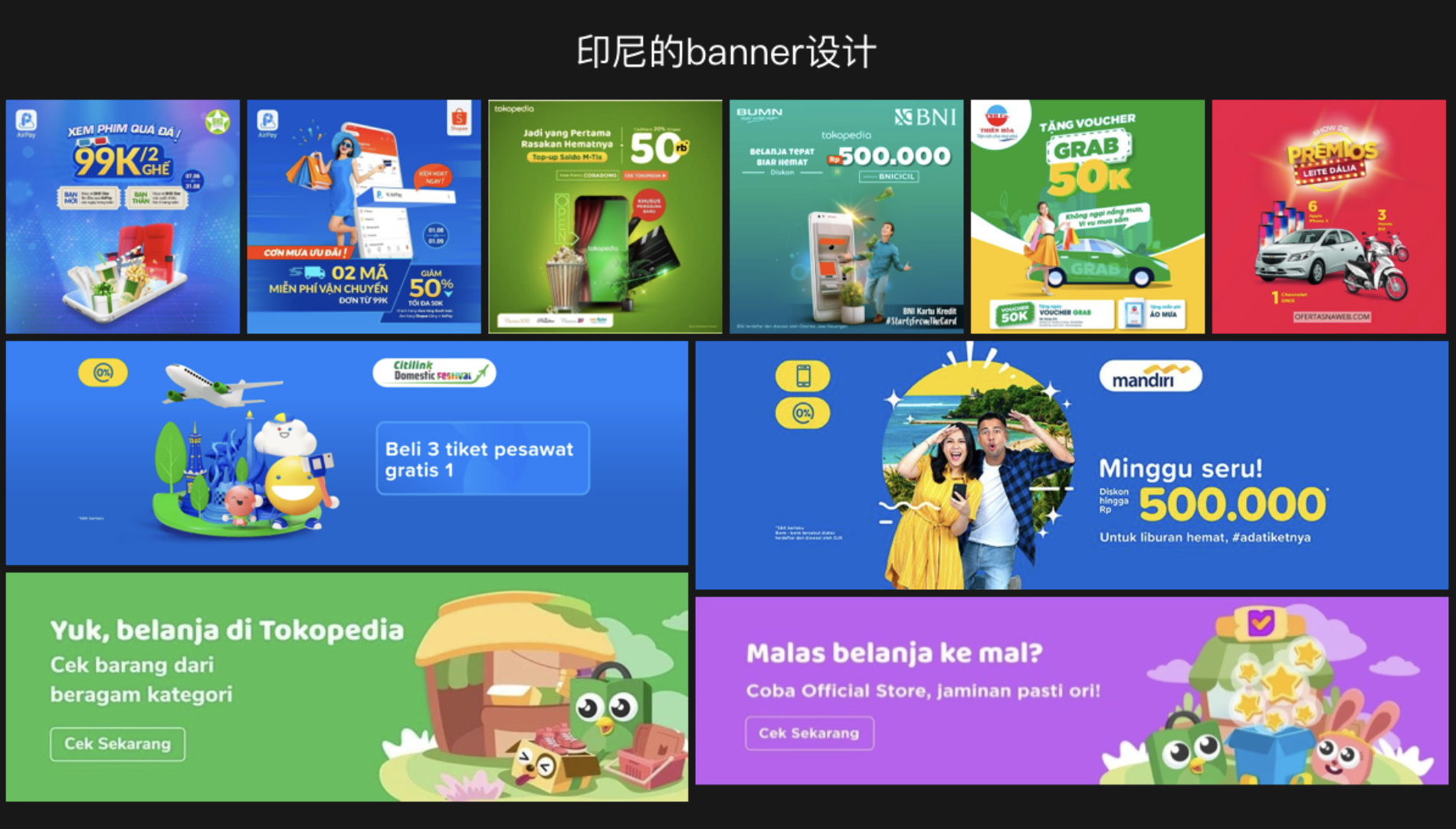 下圖是印尼本土的 banner 風格,local 的設計偏愛使用濃重的色彩,且純度大于明度。背景大部分是采用純色,沒有過多的氛圍裝飾。運用高飽合度色彩的前進感,使主體從背景中突出