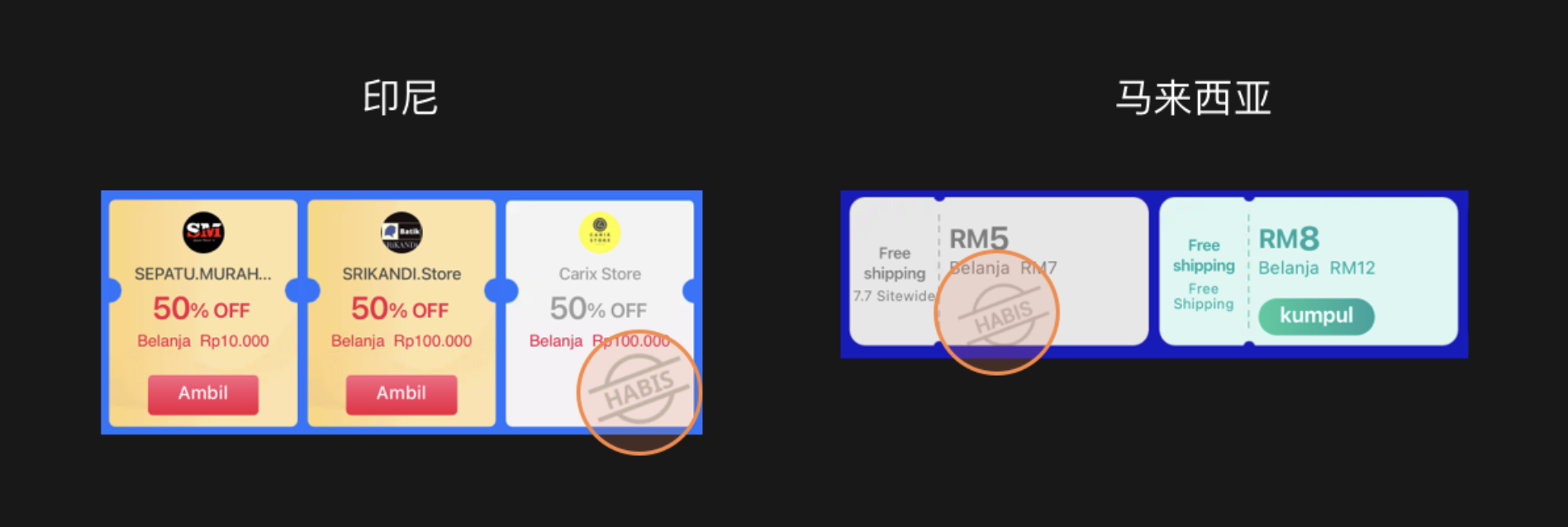 比如說優(yōu)惠券的 Ran out 狀態(tài),印尼和馬來都是 Habis, 都代表結束的意思。