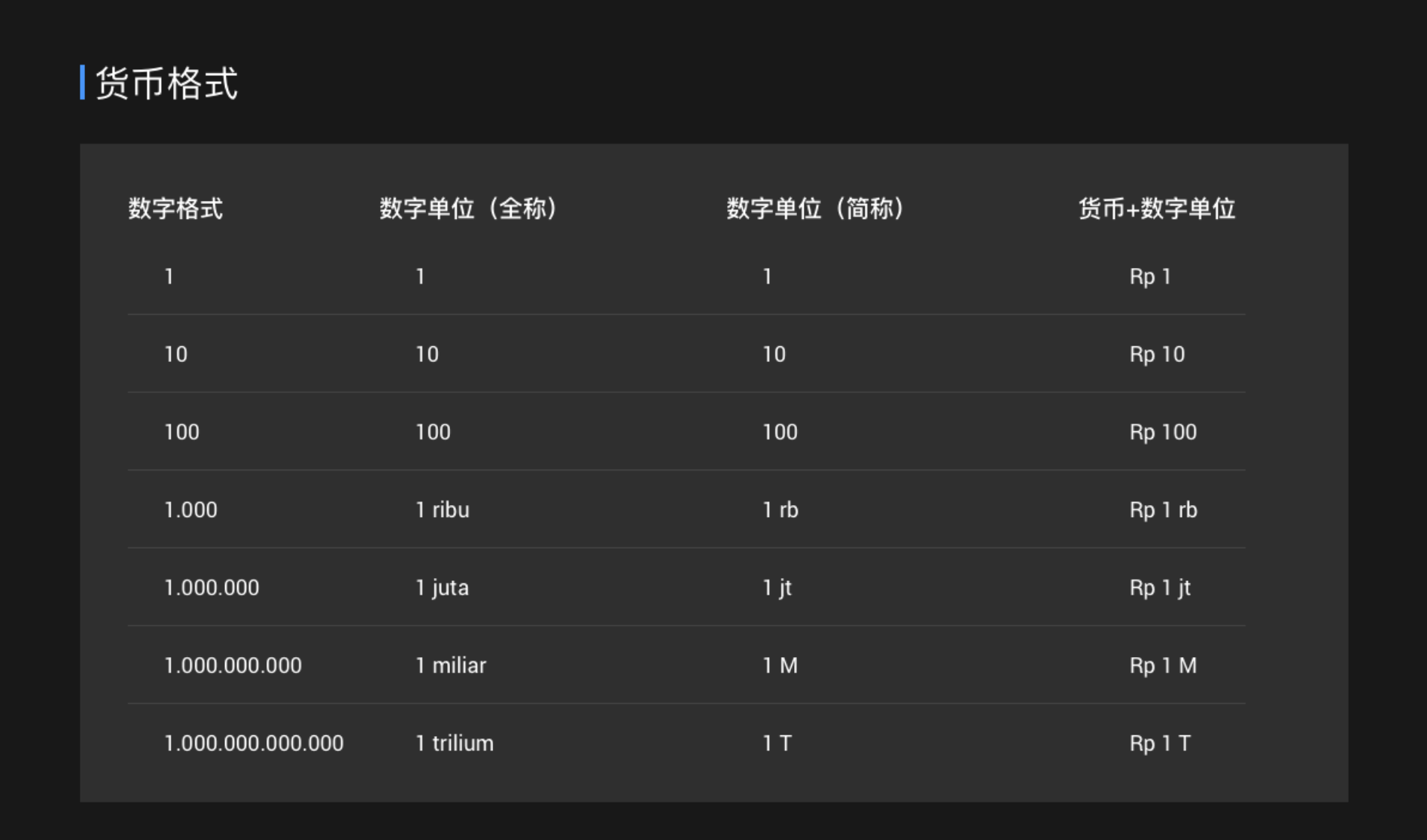 印尼的貨幣符號是 Rp,貨幣名稱是 IDR ( 印度尼西亞盧比)。 在印尼,表示千位的寫法有兩種,Rp2.000 或者是 Rp2 rb ( rb 是 ribu 的縮寫 ), 但是 Rp2.000 的用法更多些。印尼沒有萬的概念,對于大額的數字,在正式場景中,比如商品標價或銀行的收據,都會將金額全部展示出來,不會使用縮寫。只有在非正式場合,例如需要快速吸引人眼球的新聞標題或海報中才會出現。