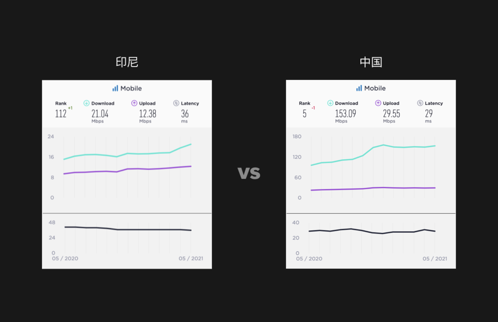 下圖是 2021 年數據,印尼的下載網速 21.04Mbps, 在全球排名 112。中國的下載網速是 153.09Mbps, 全球排名第 5,進行對比后大家對印尼的網絡環(huán)境應該更有體感了。