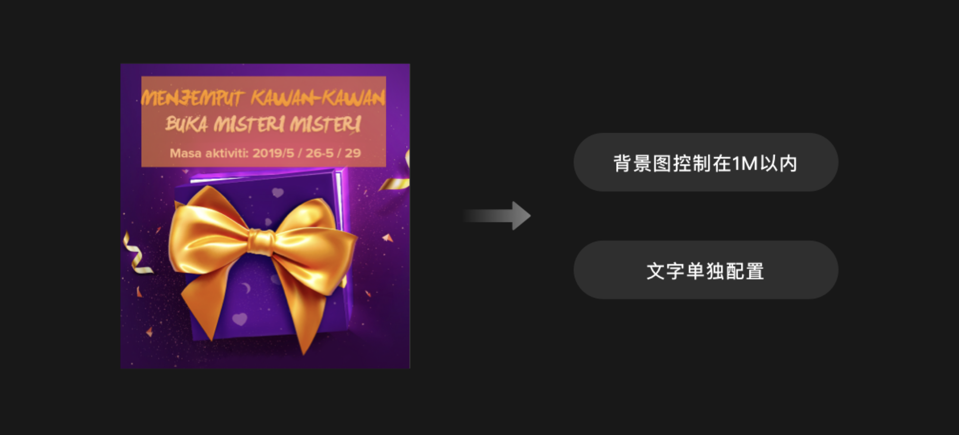 注意不要將文字直接嵌入圖片或視頻媒體中,需要分別以較小的個體進行存儲,便于替換。交付給開發(fā) GG 的圖片也必須壓縮一下,不能超過 1M,不然會影響加載速度。