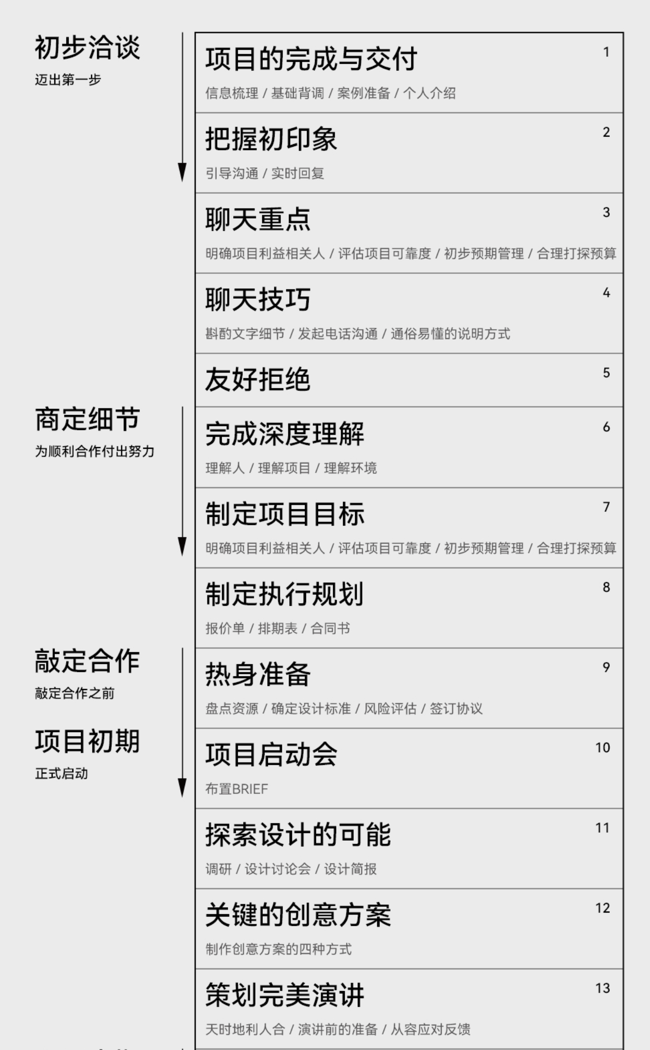 2. 商定細節(為順利合作付出努力):明確聊天重點,了解項目利益相關人、評估項目可靠度、進行初步預期管理及合理打探預算;掌握聊天技巧,如斟酌文字細節、適時發起電話溝通、采用通俗易懂的說明方式;學會友好拒絕不合適的合作。