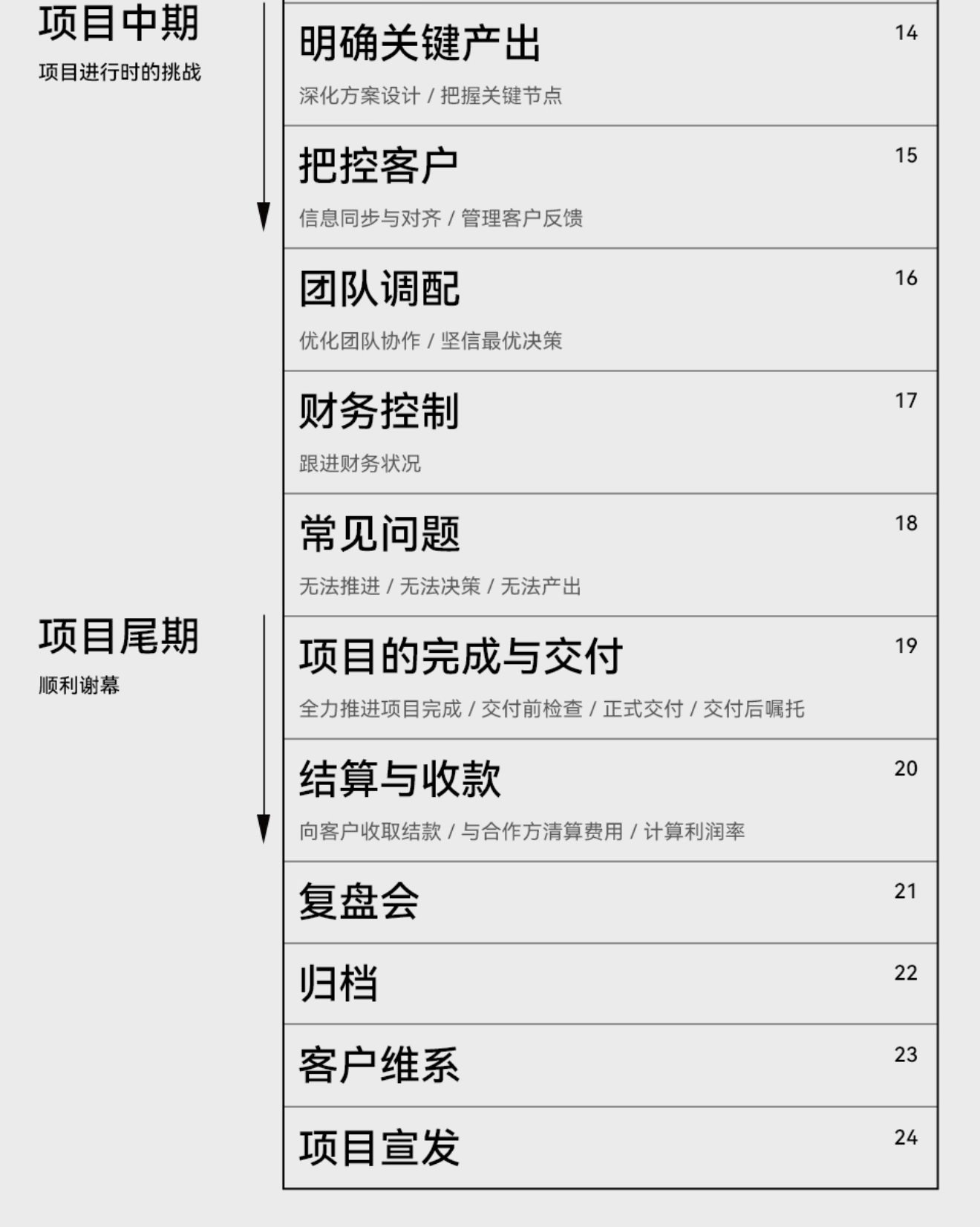5. 項目中期(項目進行時的挑戰):明確關鍵產出,深化方案設計并把握關鍵節點;把控客戶方面,做好信息同步與對齊,管理客戶反饋;進行團隊調配,優化協作并堅信最優決策;做好財務控制,跟進財務狀況;應對常見問題,如項目無法推進、決策受阻、產出困難等。