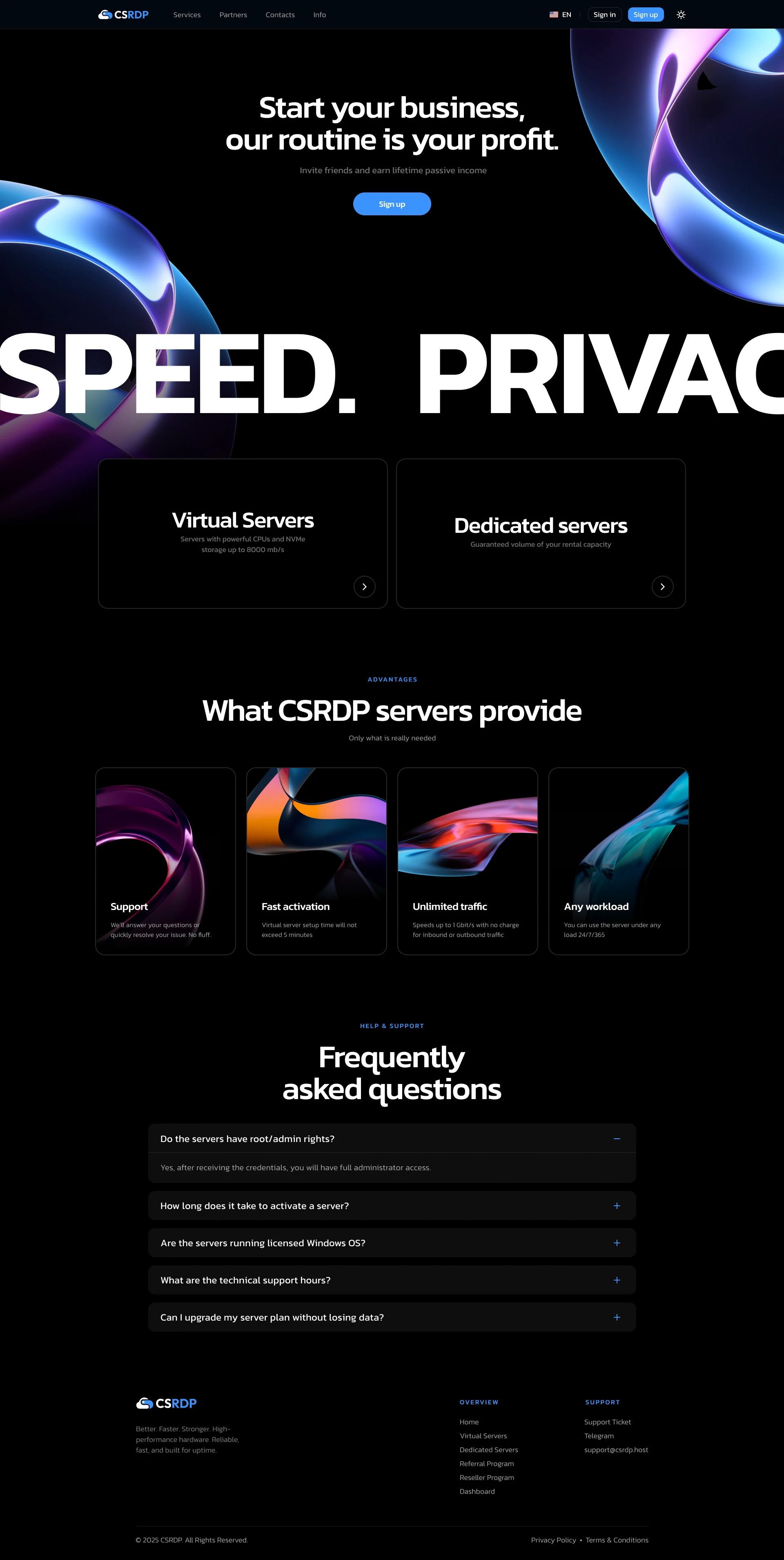 簡(jiǎn)潔的導(dǎo)航條包含主要欄目(Services, Partners, Contacts, Info)。