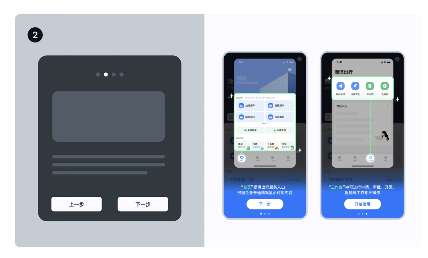 - 例子:滴滴企業(yè)版的新手引導,先講 “首頁有出行服務入口”,再講 “工作臺能審批、開票”,每步只傳遞一個信息,用戶不會覺得混亂;