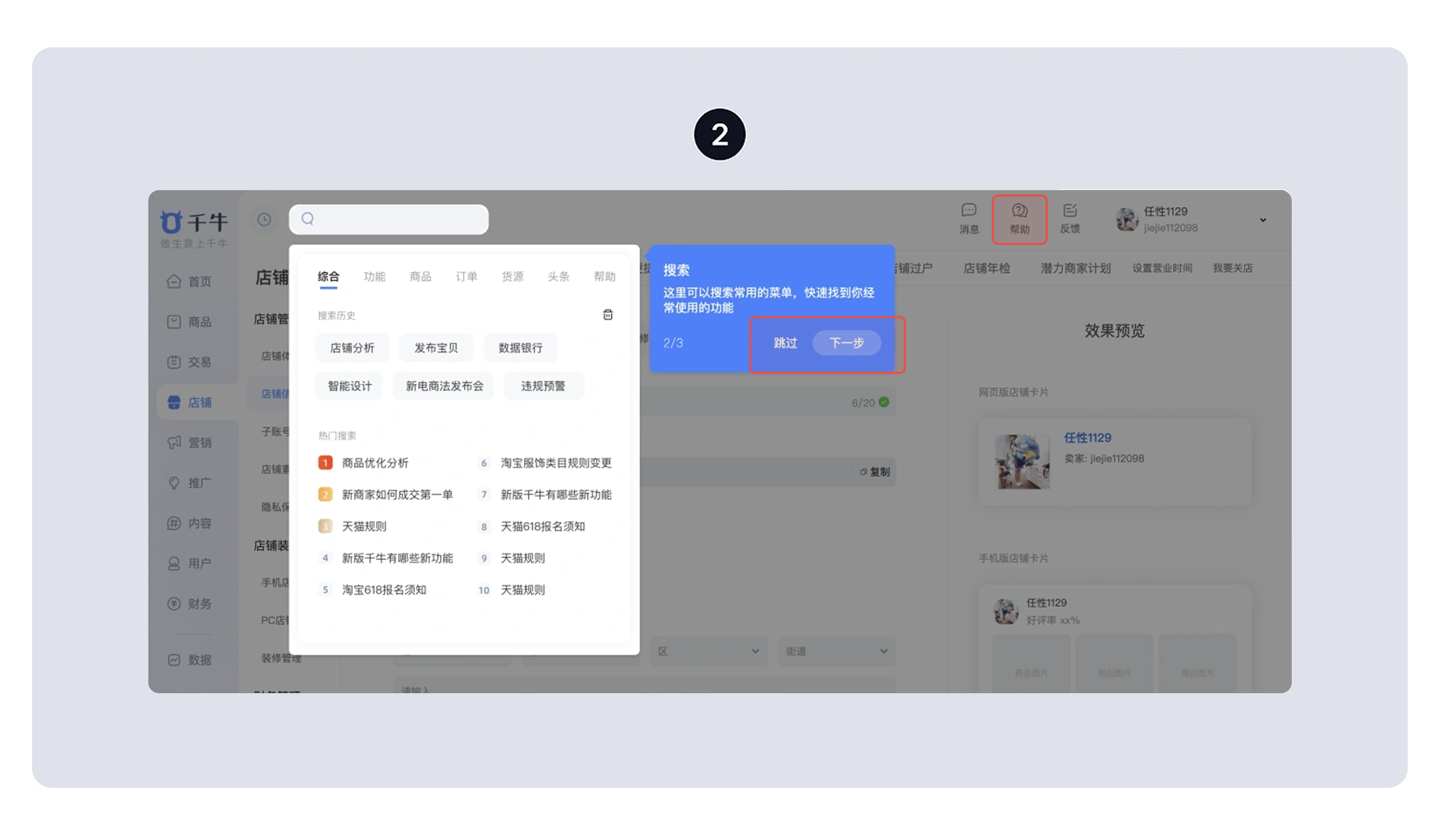 - 例子:千牛 APP 的新手引導會提示 “這里能搜索常用功能”,用戶可以點 “下一步” 繼續(xù)看,也能直接點 “跳過”;Notion 沒有強制引導,而是單獨做了 “幫助頁面”,用戶有問題再去查;