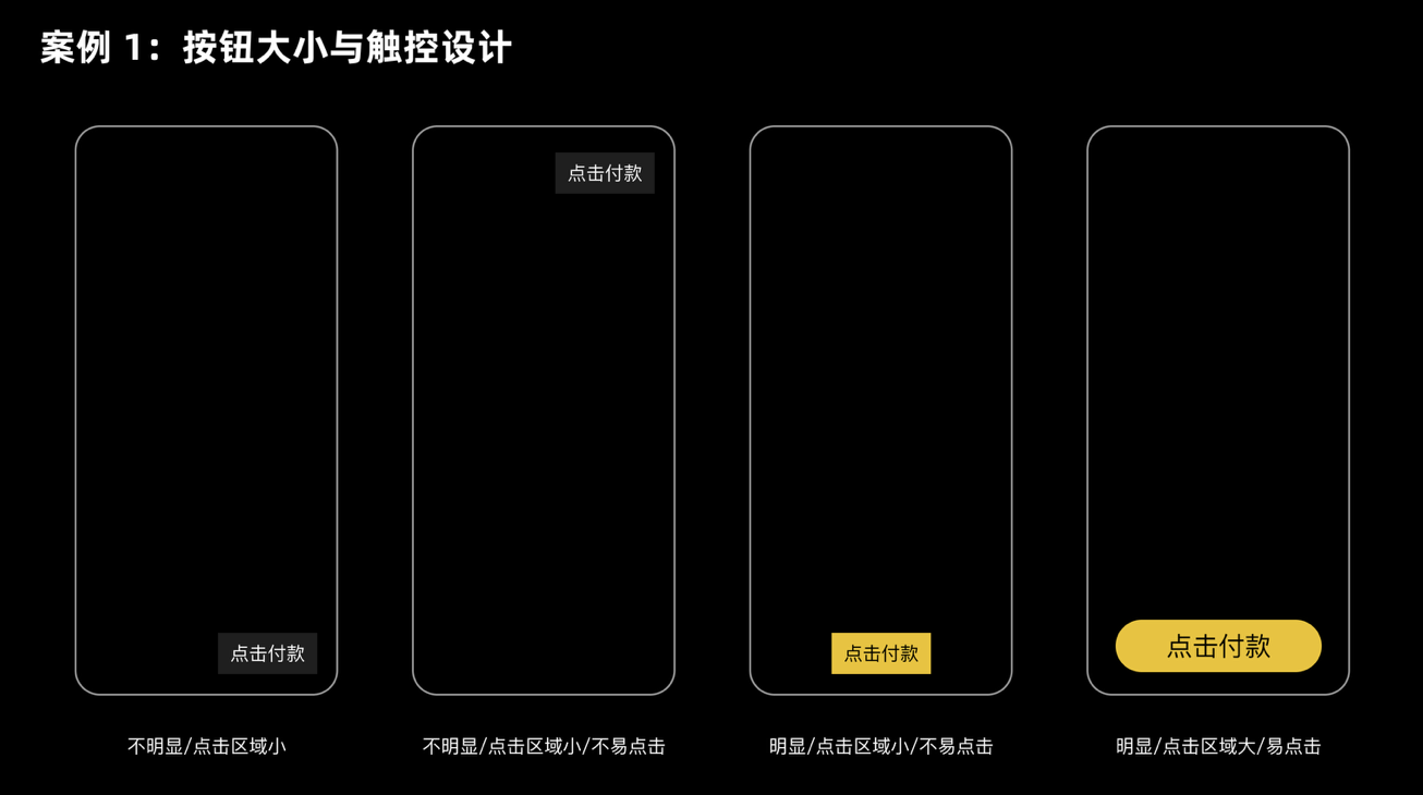 比如支付頁面的 “確認付款” 按鈕,幾乎所有 APP 都會把它設(shè)計成頁面中最大、最醒目的元素,不僅尺寸足夠,還會放在拇指容易觸及的區(qū)域(如手機下半屏)。這樣一來,用戶無需猶豫就能快速點擊,既減少誤操作風險,也間接提升了支付轉(zhuǎn)化率。