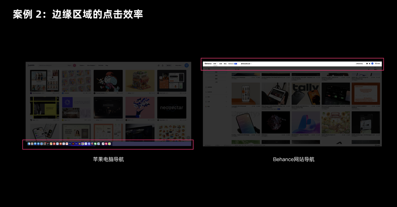 屏幕邊緣是被很多設(shè)計師忽略的 “黃金區(qū)域”—— 因為邊緣能擋住手指或鼠標的移動,相當于給目標加了 “天然邊界”,用戶不用刻意控制精度就能快速定位。這就是為什么 Mac 的 Dock 欄、Windows 的任務(wù)欄都放在屏幕底部或側(cè)邊,而不是中間。