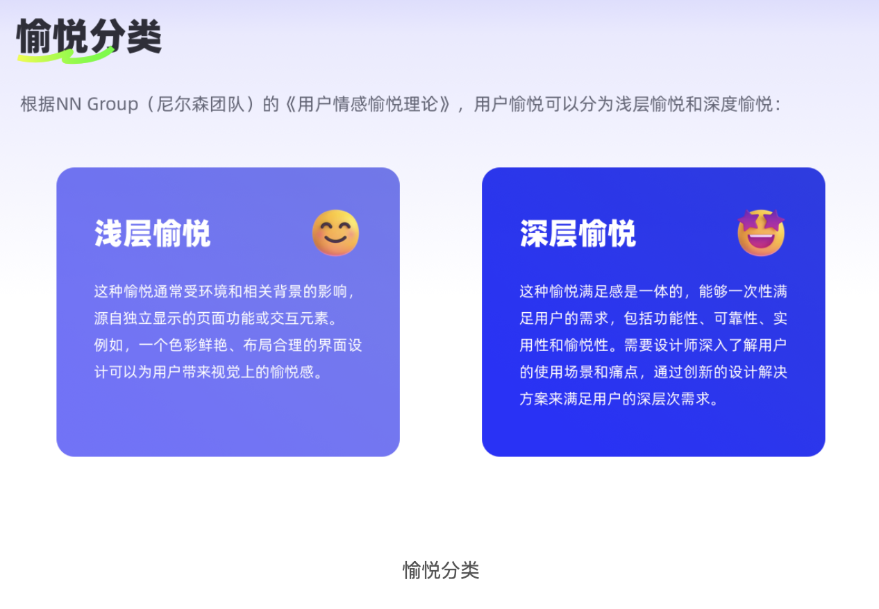 根據(jù)尼爾森團(tuán)隊的《用戶情感愉悅理論》,設(shè)計帶來的愉悅感分為兩種,二者的價值和實現(xiàn)方式截然不同,混淆它們很容易讓設(shè)計 “浮于表面”。