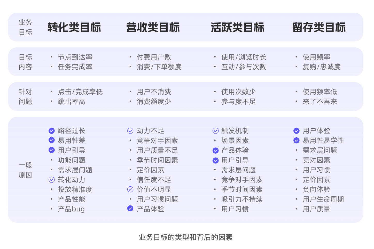 先判斷業(yè)務(wù)目標(biāo)屬于哪一類,再定位核心痛點(diǎn)。四大類業(yè)務(wù)目標(biāo)的核心問(wèn)題的如下: