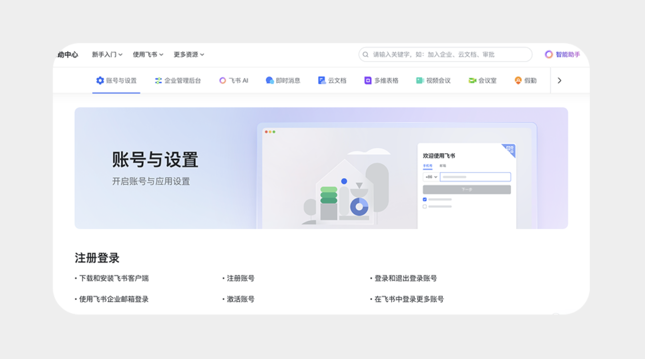 在標簽欄兩側(cè)添加左右箭頭,點擊即可展示更多標簽,適合功能模塊較多的 B 端產(chǎn)品或網(wǎng)頁。比如飛書的幫助中心頁面,標簽頁涵蓋 “智能助手”“云文檔”“視頻會議” 等多個功能,通過左右箭頭切換,既保證界面整潔,又能完整呈現(xiàn)所有選項,不影響用戶操作流程。