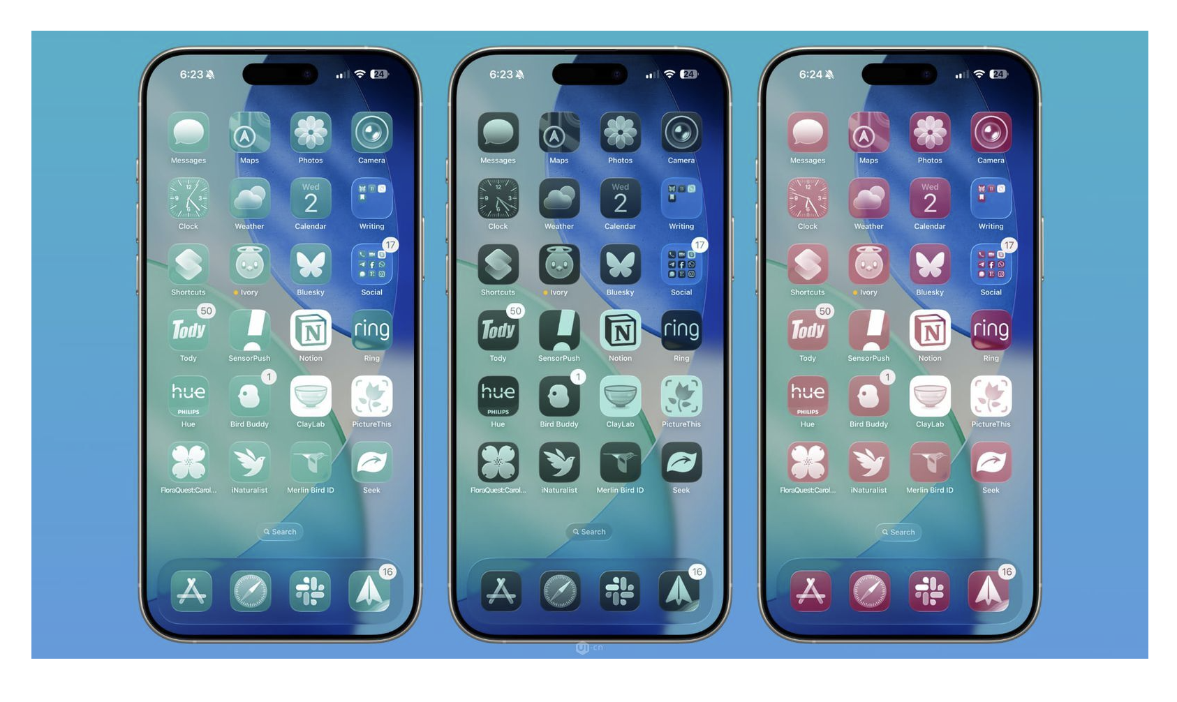 圖標系統迎來重大升級,除了默認、深色、有色三種樣式,新增的 "清除圖標" 堪稱點睛之筆。這種圖標完全透明,直接借用壁紙顏色,僅以上方的白色圖形標識功能,搭配 "淺色(磨砂玻璃質感)" 和 "深色(有色玻璃質感)" 兩種選項,讓桌面風格既能極簡純粹,又能與壁紙形成巧妙呼應。