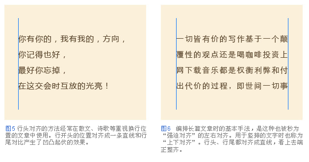 排版中重要的一條,是把應該對齊的部分對齊,例如每一個段落的字行對齊,就是把行的位置進行對齊使其一致的方法。行頭對齊是所有行均在行頭對齊的方法(圖5)雖說這種用法使得行尾不齊整,但方便文章的停頓部分換行,適用于散文、詩歌等表現(xiàn)韻味的文字版式。但是,對于編排長篇文章時,選擇左右對齊更能體現(xiàn)條理性。由于換行的位置都相同,閱讀行頭或換行的時候視線能夠平緩流暢地移動。