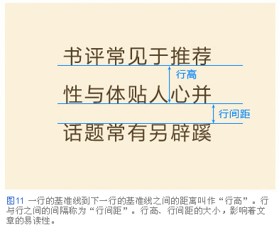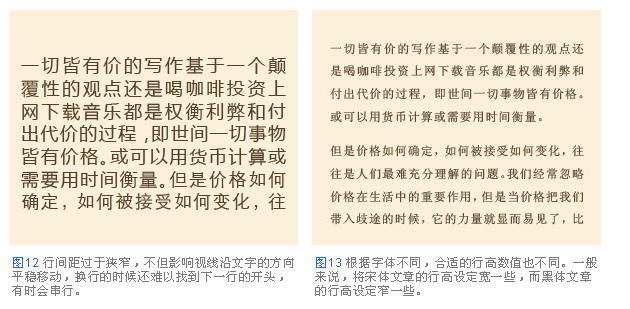 行高,行間距的大小對文章的易讀性有很大的影響。行與行之間拉得過開,從一行末尾移動到下一行開頭,視線的移動距離過長增加了閱讀難度。相反,行與行之間貼得過緊,上下挨得過緊影響了視線的移動,讓人不知道正在閱讀哪一行(圖12)。正文最恰當?shù)男懈撸緫撛O(shè)定為其文章中文字大小的兩倍。例如文字大小為8px的文章,就應該把行高設(shè)定為16px(圖13)