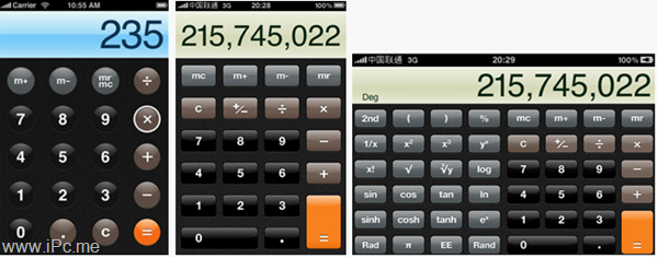 iPhone游戲里出現(xiàn)橫豎屏設計比較正常,都是視具體的游戲類型來分。但一般的效率型應用或實用工具,也是橫豎屏都有。林子大了,什么鳥都有,有 些用戶就是喜歡經常將屏幕旋轉過來,而且還不在少數(shù)。他們或是喜歡橫屏的瀏覽方式(如備忘錄、音樂),或是希望打橫可以看到更多的信息(如計算器)。設計 的時候必須充分考慮用戶的期望。有時將界面內容旋轉就可以簡單滿足他們的需求,但有時也需要你重新去設計以展示更多的內容(如橫屏的音樂會出現(xiàn)一個新的界 面,展示所有的歌曲)。