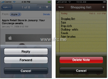 屏幕的底部一般是輔助性的工具欄或切換視圖使用的頁簽欄。一些影響較大的操作如果出現(xiàn)在屏幕下半區(qū)域,必須仔細考慮它們的排列設計。如圖5.1,一 般情況下,操作面板的取消按鈕放在最后,這樣可以鼓勵用戶閱讀完所有的選項,暗藍色的返回按鈕可以和一般的按鈕區(qū)分開來,即便用戶沒閱讀完也知道這是返回 按鈕。對于一些影響較大的操作(如刪除),將其放在面板的頂部是最好的,因為頂部更容易被看到,再加上紅色的警告暗示,用戶選擇起來會更為慎重。