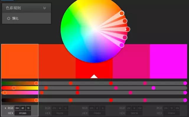 adobe,這個是Adobe公司出的,他提供了多種配色方案。我們點擊圓盤中間的點,就可以調整出我們想要的配色方案:https://color.adobe.com/zh/create/color-wheel