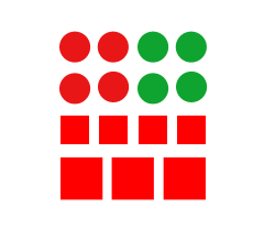 相似原則 強調的是內容。人們通常把那些明顯具有共同特性(如形狀、大小、顏色等)的事物組合在一起,即:相似的部分在知覺中會形成若干組。下圖中,根據形狀,我們將其看成圓形和方形;根據大小,我們又可將方形看成大方塊和小方塊;根據顏色,我們可以將圓形看成紅色和綠色兩個整體。
