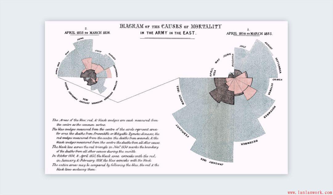1857年,英國護(hù)士佛羅倫斯·南丁格爾使用信息圖形,說服維多利亞女王改善軍隊(duì)醫(yī)院的條件。她的圖表顯示了克里米亞戰(zhàn)爭每個(gè)月的死亡人數(shù)和原因:可預(yù)防的藍(lán)色疾病,紅色傷口和其他黑色病因。