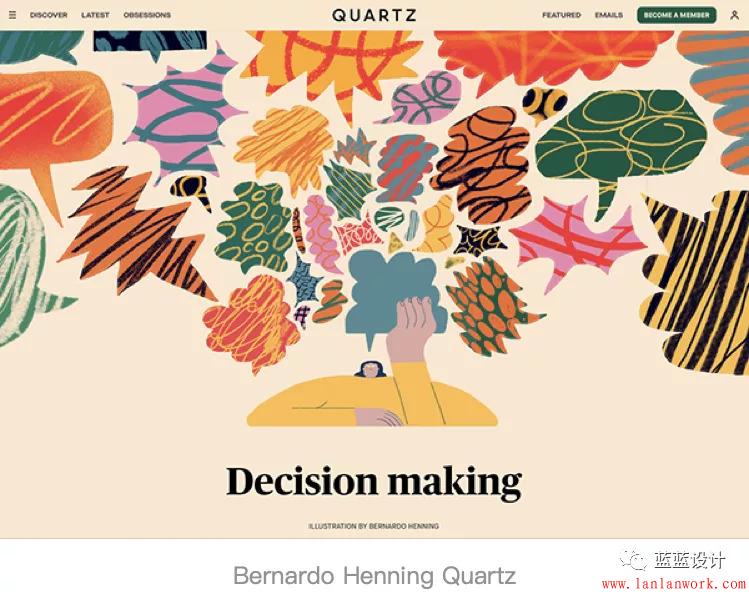 這種風(fēng)格的插畫非常像凌亂的涂鴉,乍看未完成,但所有的細節(jié)都是經(jīng)過深思熟慮的。重疊的形狀和強烈的色彩讓這些插畫與眾不同,同時能有效激發(fā)靈感。