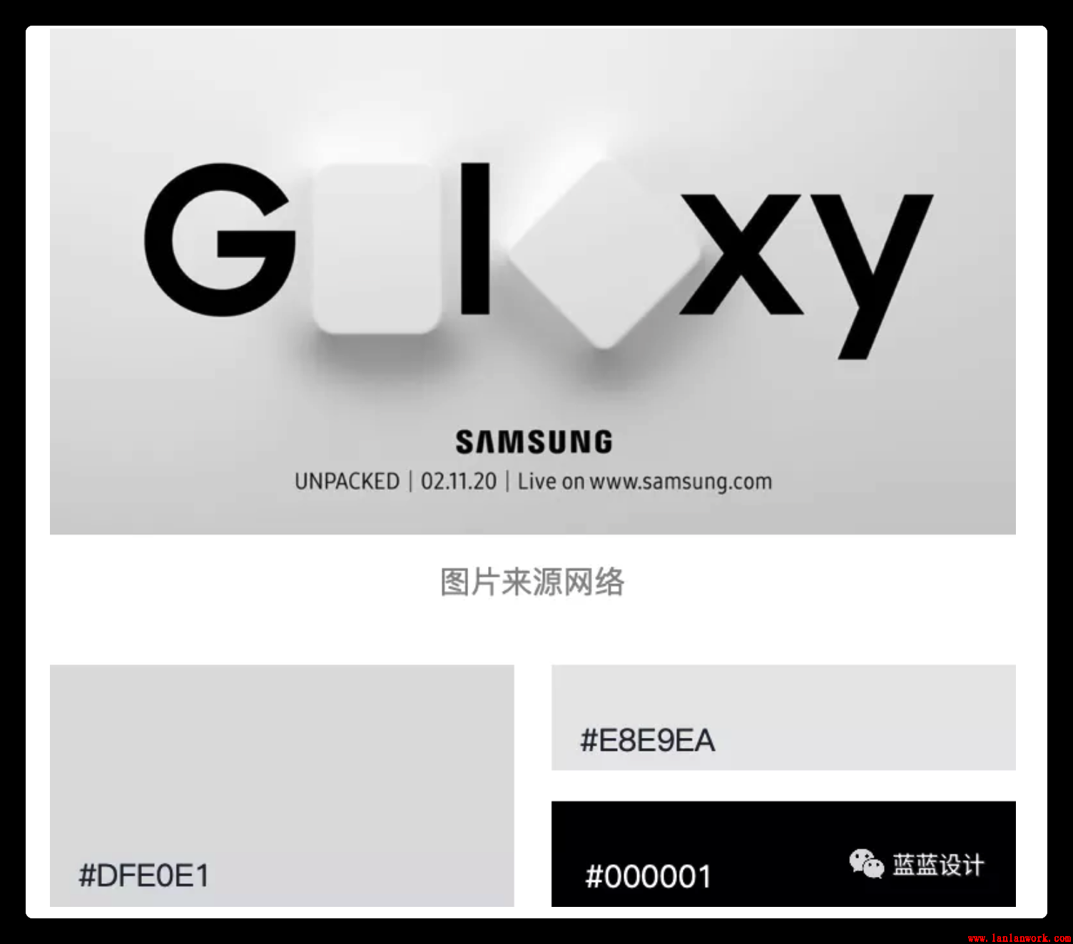 在2020年2月11號舉行的三星視覺發(fā)布會使用新擬態(tài)的設(shè)計手法作為設(shè)計海報。帶有漸變的淺灰色背景,結(jié)合富有層次感的光影漸變,充滿未來感。相對克制的色彩選擇和多角度的光影變化,強調(diào)出產(chǎn)品豐富的質(zhì)感和科技感,簡潔而神秘。
