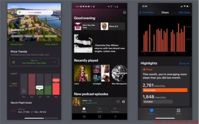 Wego、Spotify和蘋果的手機應用在暗黑UI設計上做得很好。這些手機應用遵循深色UI設計的原則,即只在邊框上使用純正的黑色,在不同的標高水平上使用適當的陰影元素,以及有限的強調色。