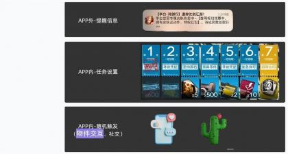 這點和常規做產品的觸點很類似,雖然是做教育產品,但其本質還是產品。因此用產品的思路,在用戶未進入產品時,用 APP 推送等方式提醒用戶上線;而在進入產品內,在主線上,以任務的方式督促用戶學習,同時增加一些隨機觸發的學習任務,提升學習行為觸發的觸點。