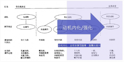 回歸到自我決定理論來看,大部分學生都處在非自我決定的階段,以無動機或外在動機的外部調節和內投調節為主,他們對學習沒有動機,很難堅持。從動機側來看,我們要做的是把學生的動機內化/強化,去提升學習效率和學習效果的提升。