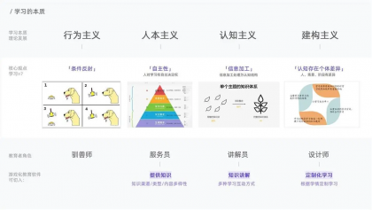 學習本質的理論基礎經過了 4 個時期的發展,從行為主義、人本主義、認知主義再到建構主義,對于教育者/方的要求越來越高。