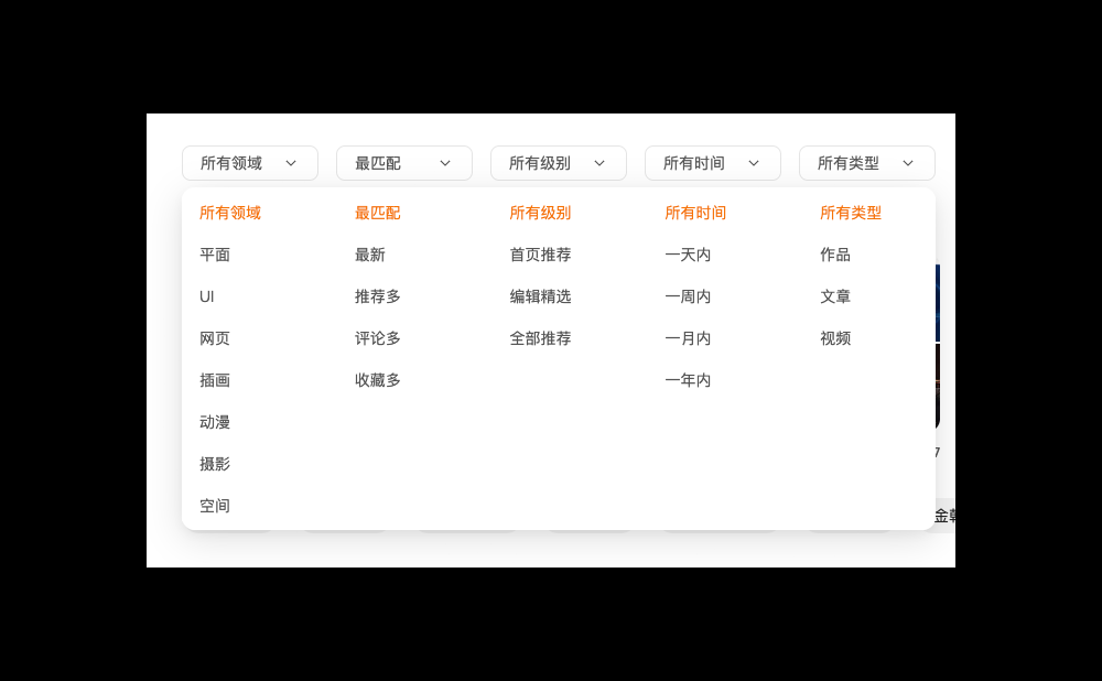 我們可以通過,將這些選擇進行分類打包,以站酷為例子將類似功能進行分類或者分頁面,幫助用戶梳理進行梳理。