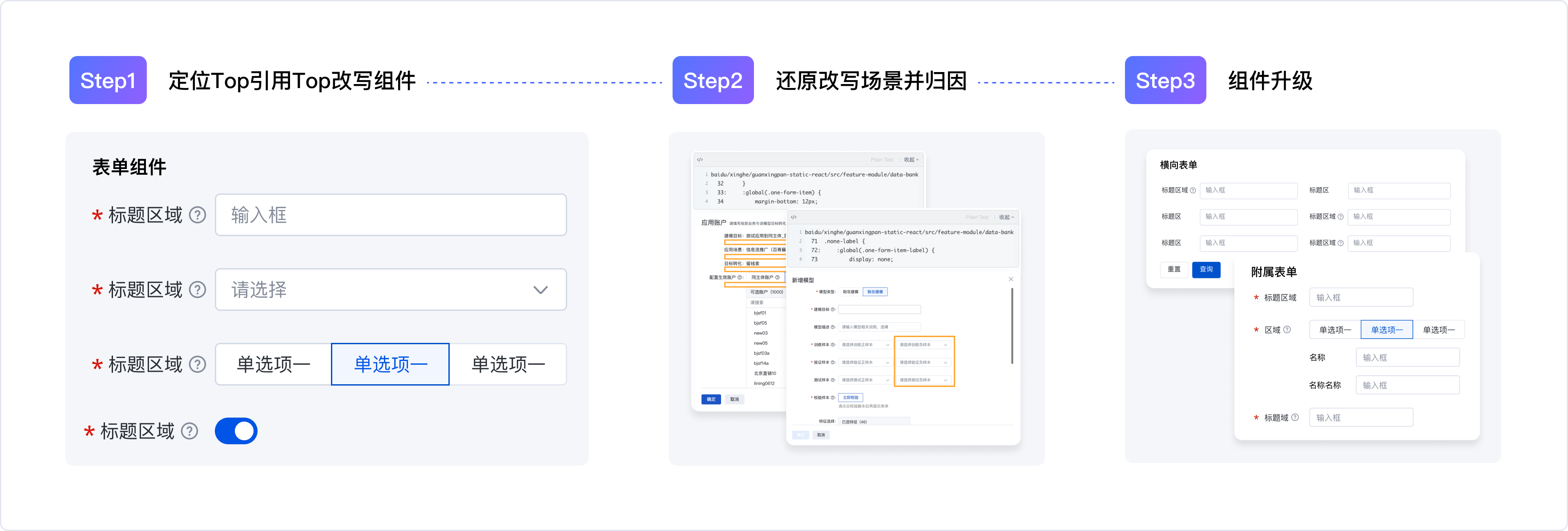 2.還原具體改寫場景并分類歸因:針對"表單"組件,拉取了改寫的css代碼,逐一分析都改寫了哪些樣式。從中提煉出共性的改寫場景,進(jìn)行分類歸因。于是可以把表單組件的改寫問題分為4大類,分別是行間距問題、標(biāo)簽寬度問題、橫向表單缺失問題、附屬表單樣式規(guī)范問題。